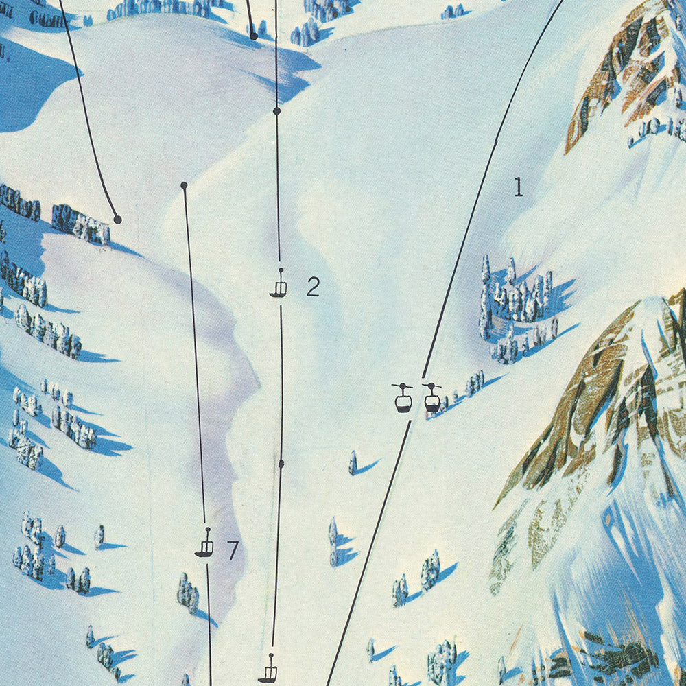 For skiers and historians alike, Berann’s treatment of the slopes is a masterclass in clarity. Divisions of terrain by skill level are embedded in his color and linework, from approachable pistes on the Lower Mountain to more demanding pitches off Headwall and the bowls. North Bowl and South Bowl open like amphitheaters; Solitude and Snow Valley promise quieter aspects; Gold Coast and Upper Mountain read as hubs of both training and recreation. The map is navigationally lucid yet emotionally evocative, conveying not just where one can ski, but how the mountain feels underfoot—steepening, easing, and funneling in rhythms that defined the Olympic courses and everyday runs alike.