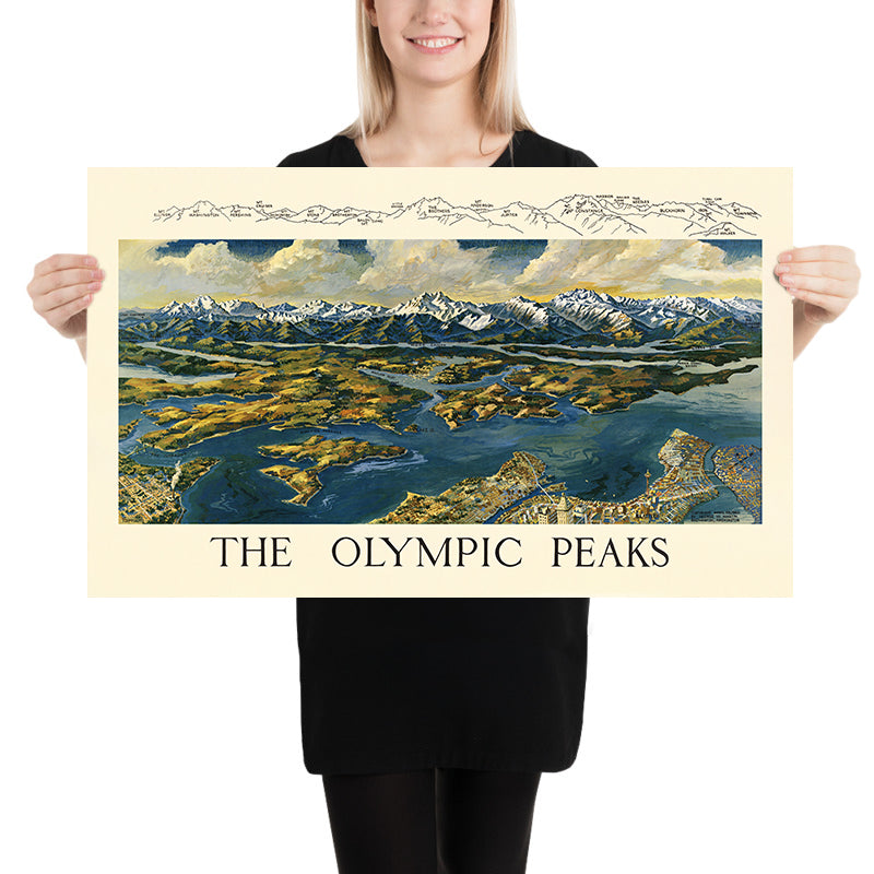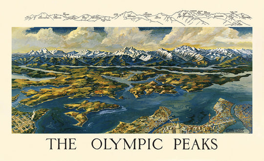 • Visual Style: Bird’s-eye view with vibrant colors and detailed illustrations of the Olympic Mountains and adjacent landscapes.