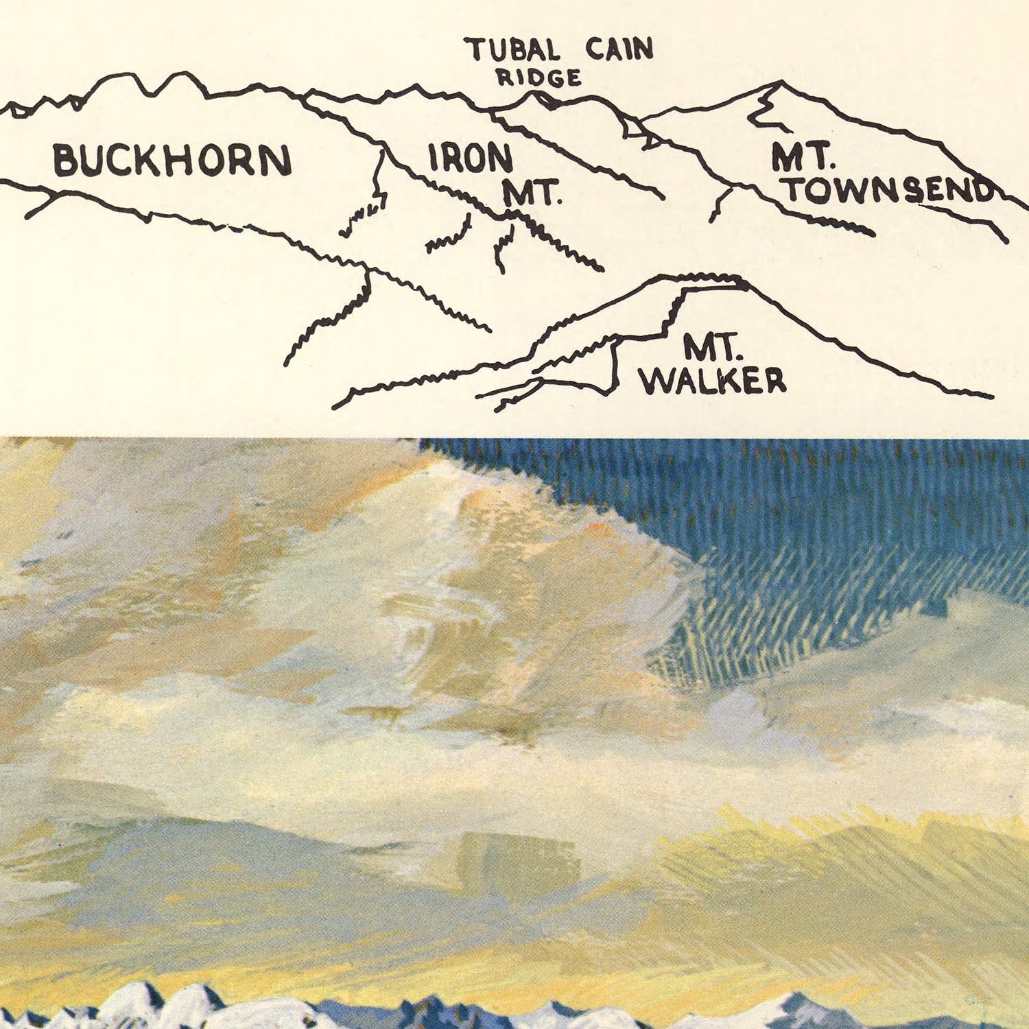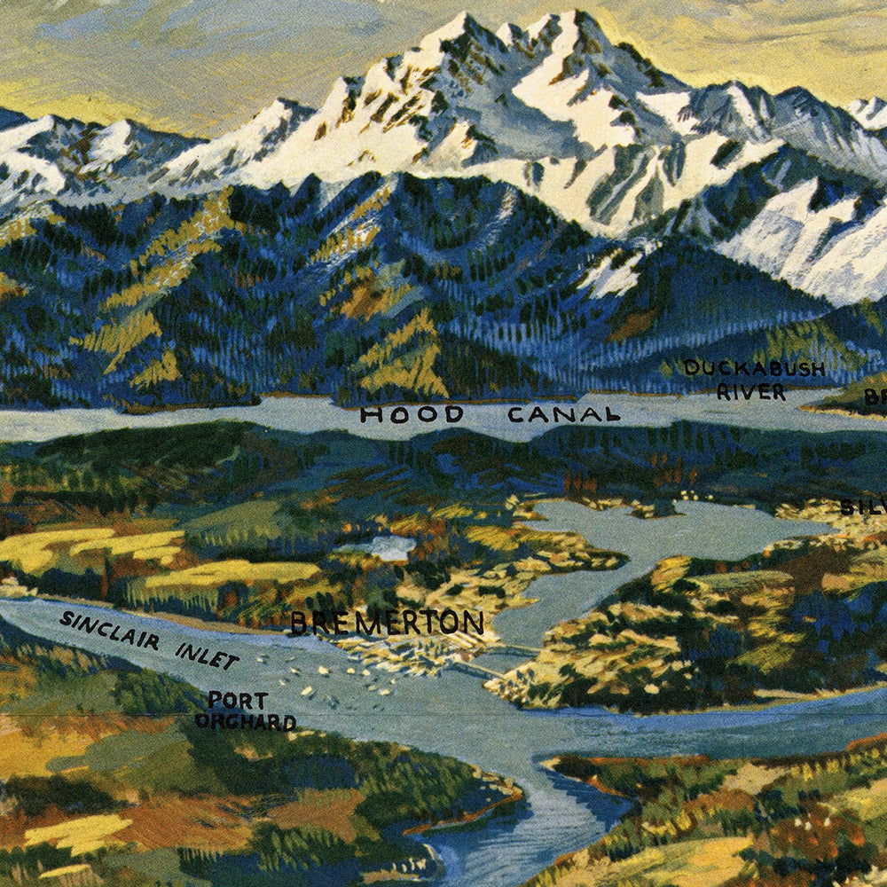 The heart of the composition is the Olympic range, rendered as a sculptural procession of named summits—Mt. Ellinor, Mt. Washington, Mt. Crusoe, Mt. Pershing, Mt. Stone, Mt. Anderson, Mt. Jupiter, The Brothers, and Big Cedar Mountain—each peak rising as a landmark with its own personality. The artist’s elevated perspective lets the eye trace ridgelines and valleys as they tumble toward saltwater, evoking the drama that inspired early park advocates and mountaineers. Historically, these peaks were visual wayfinders for mariners and symbols of the enduring wilderness that shaped conservation debates from the 1930s through the postwar outdoor boom, culminating in a 1960s public newly attuned to recreation and preservation.