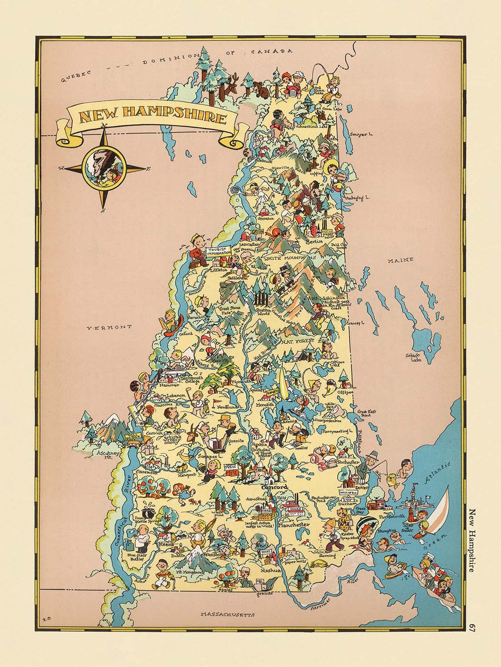 Bildkarte von New Hampshire von Ruth Taylor White, 1935: Manchester, Nashua, Concord, Seen, Berge