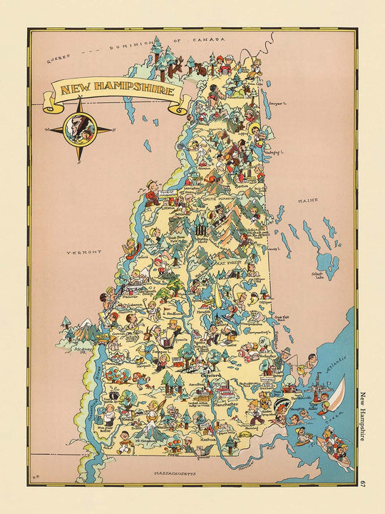 Schritt in die lebendige Welt von Neuengland der 1930er Jahre mit „New Hampshire“, dem ursprünglichen Titel dieser fesselnden bildlichen Karte, die 1935 von Ruth Taylor White erstellt wurde. Mehr als nur ein einfaches kartografisches Dokument ist diese Karte ein lebhaftes Tableau, das vor Farbe und Laune sprüht und den Geist und Charakter von New Hampshire einfängt, wie er im frühen zwanzigsten Jahrhundert populär vorgestellt wurde. Jede Region des Staates wird durch eine entzückende Reihe von Illustrationen zum Leben erweckt, die einen Blick auf die Landschaften, Industrien und kulturellen Motive bieten, die die Identität von New Hampshire zu dieser Zeit prägten.