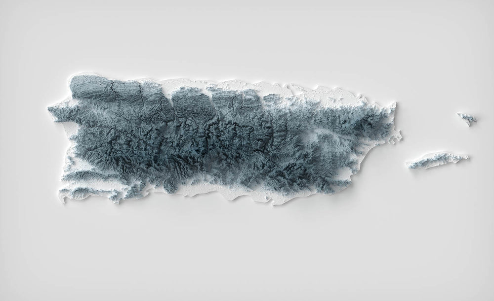 Um die Hauptinsel herum sind die kleineren Inseln Vieques und Culebra als bescheidene, erhöhte Formen zu sehen, die in ruhigem Relief abgesetzt sind und ihre niedrigeren Höhenlagen und sanften Profile anzeigen. Durch die Karte hinweg hebt der sorgfältige Einsatz von Schatten und Akzenten den dynamischen Kontrast zwischen dem rauen Inneren und den sanfteren Küsten hervor, sodass jedes Tal, jeder Höhenzug und jeder Berg mit taktiler Klarheit hervortreten kann.