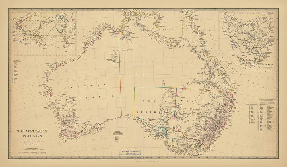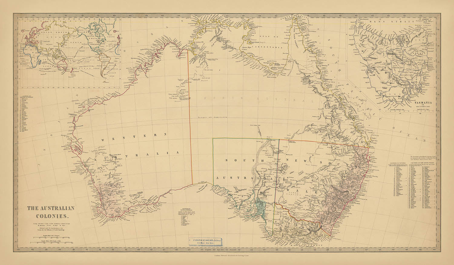 - Beinhaltet eine große Einlage von Tasmanien, das erst kürzlich 1856 von Van Diemensland umbenannt wurde.