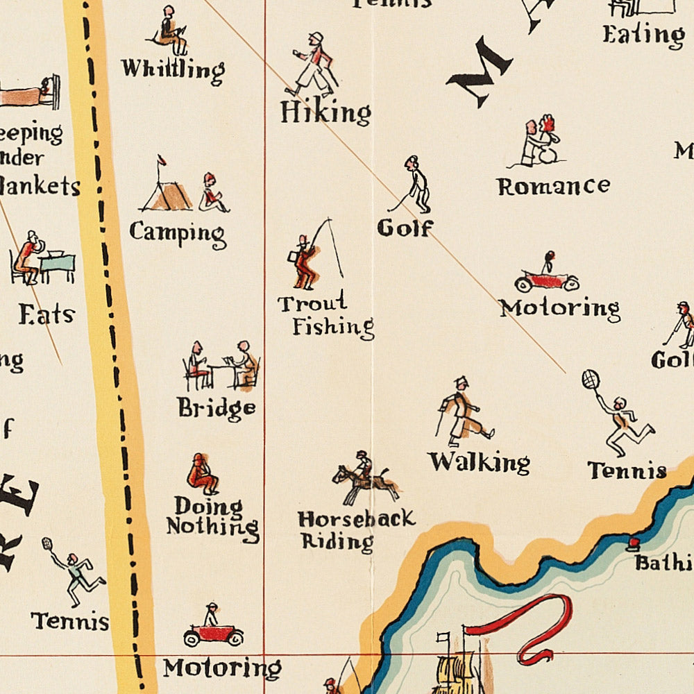This poster is notable because it translates Held’s magazine wit into a pictorial map that doubles as a travel dream-board for New England. It delineates Vermont, New Hampshire, Maine, Massachusetts, Rhode Island, and Connecticut, and dots them with irresistible prompts—labels clearly visible on the print include “Horseback Riding,” “Salmon Fishing,” “Tennis,” “Yachting,” “Fine Fishing,” “An artist hard at work,” and “Antiques for sale.” With rail lines and steamship connections funneling vacationers toward the coast and islands, the work captures the romance of early 20th-century American leisure travel.