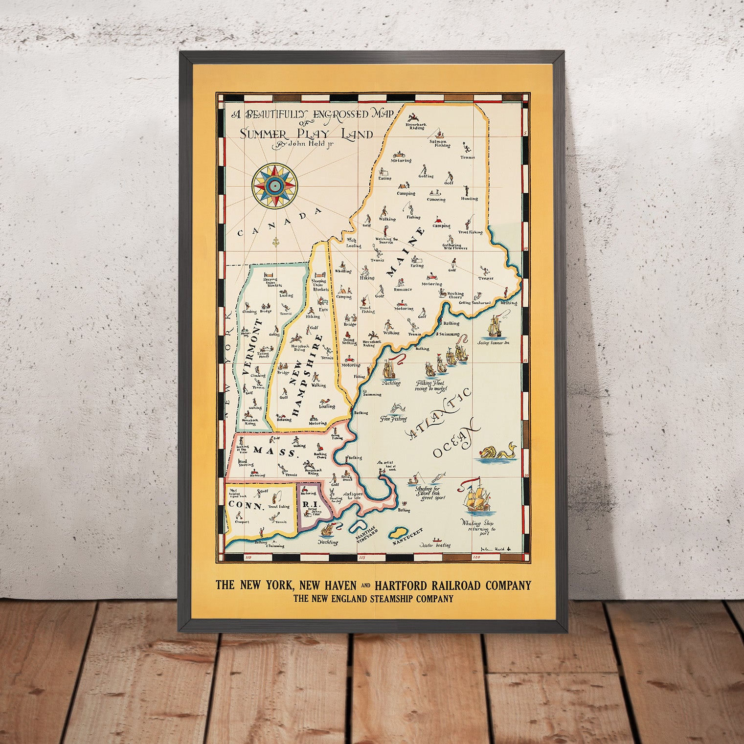 A beautifully engrossed map of Summer Play Land by John Held Jr. (1910) is a spirited antique travel poster that invites you to spend the season in New England. The celebrated cartoonist renders the six states as a playground of pursuits, peppering the scenery with droll figures and hand-lettered captions. At the base margin the poster proudly reads THE NEW YORK, NEW HAVEN AND HARTFORD RAILROAD COMPANY and THE NEW ENGLAND STEAMSHIP COMPANY—clear evidence that this was created to lure holidaymakers north to sandy beaches, yacht clubs, lakes and mountain resorts. Note the jaunty compass rose at left, the checkered border, and vignettes scattered across the coastline: a fishing fleet racing to market, a sea serpent in the Atlantic Ocean, and islands labeled NANTUCKET and MARTHAS VINEYARD.