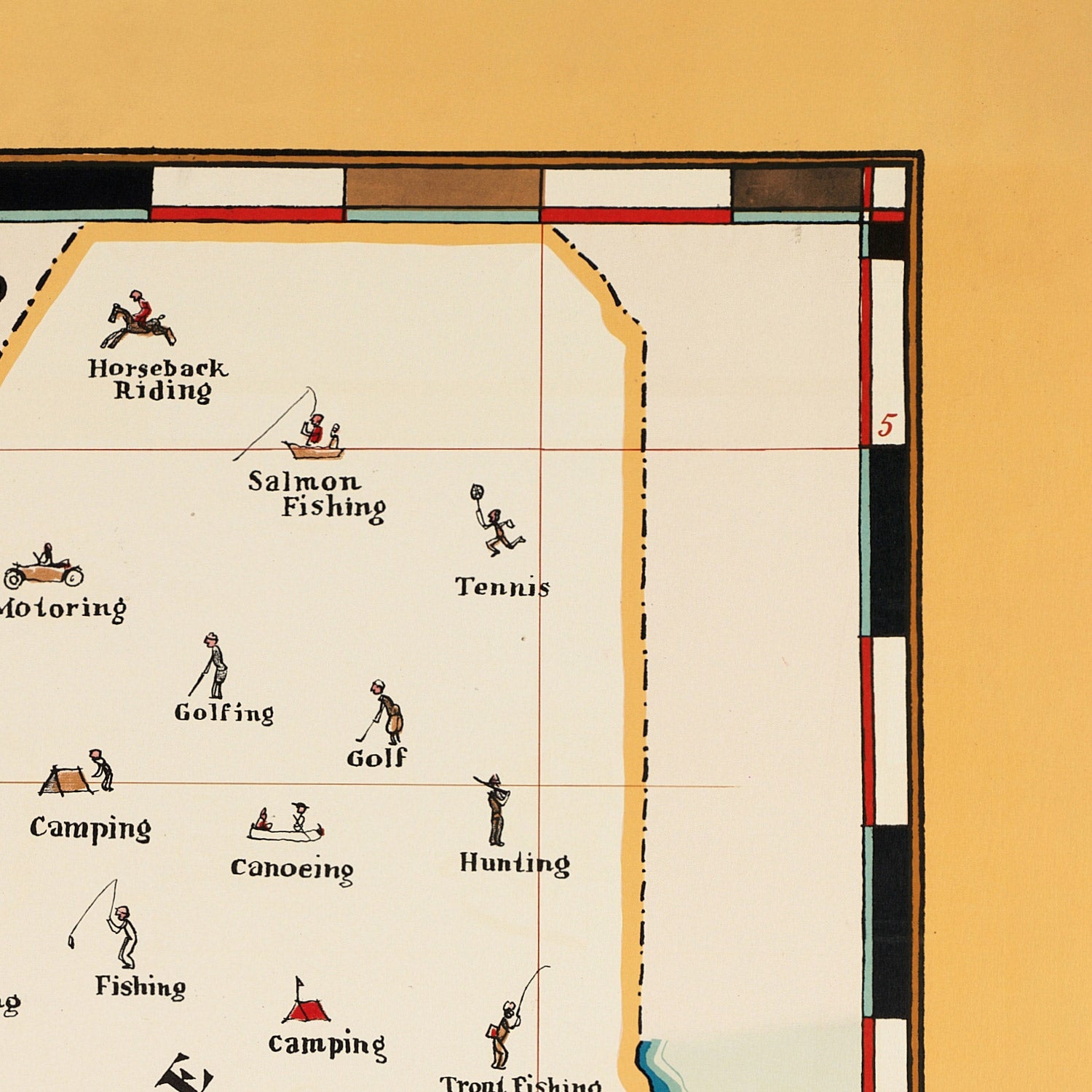 Color is a key part of its charm: a warm yellow field and border frames an ivory map face, while surf-blue and teal coastline bands shimmer against the sandy pinks of Cape Cod and the islands. The simple black cartography and Held’s elegant lettering keep the composition crisp and legible, making it ideal for a beach house, lake cottage, or city apartment that longs for sea air. The whimsical figures—golfers, bathers, canoeists, and motorists—add movement and humor, ensuring the print is both nostalgic and a conversation starter.