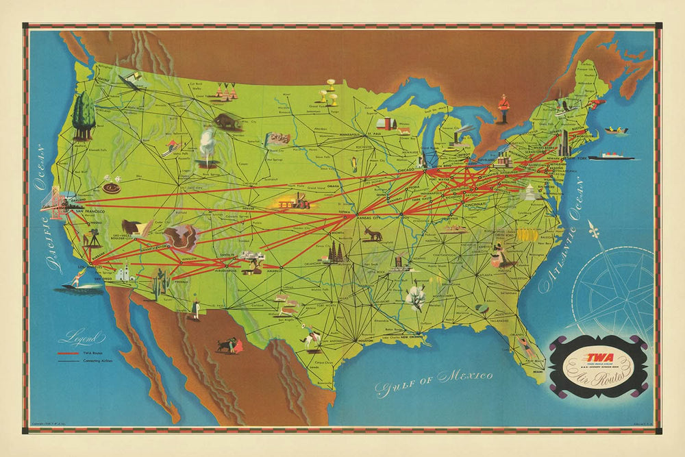 Alte TWA-Flughafenkarte der Vereinigten Staaten, 1948: NYC, LA, Chicago, TWA-Routen