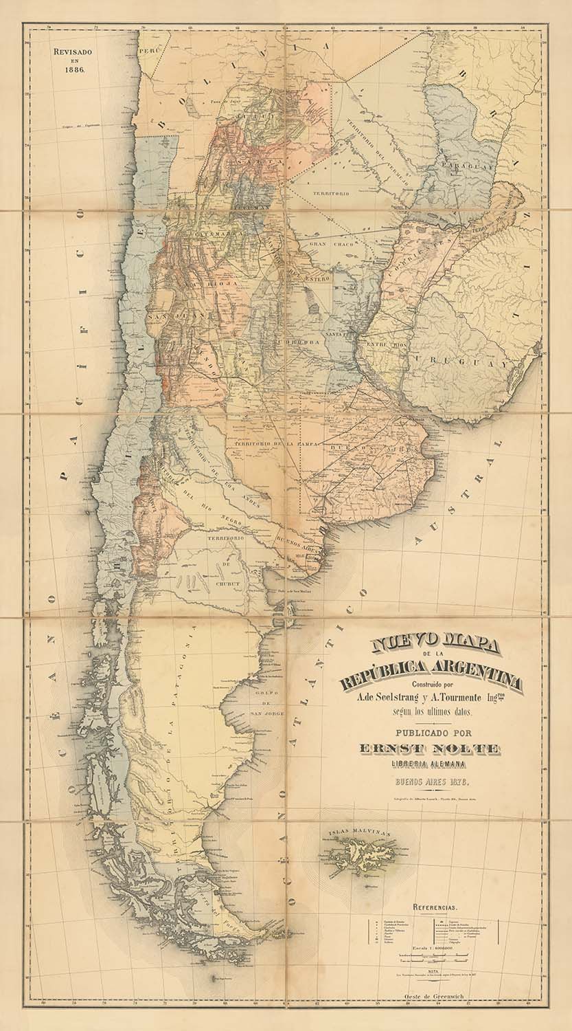 Die "Nuevo Mapa de la República Argentina", erstellt von den geschickten Händen von A. de Seelstrang und A. Tourmente und veröffentlicht von Ernst Nolte, ist ein bemerkenswertes kartografisches Werk aus dem Jahr 1886. Diese Karte erfasst eine transformative Periode in der argentinischen Geschichte, als die Nation mit Wachstum und europäischem Einfluss aufblühte. Sie zeichnet elegant die politischen und physischen Landschaften Argentiniens und des südlichen Chiles nach und bietet einen Einblick in eine Zeit, in der das Land seine Territorien und Infrastrukturen erweiterte. Die Karte ist ein Zeugnis für Argentiniens Ambitionen und seine sich entwickelnde Identität als Nation der Möglichkeiten.