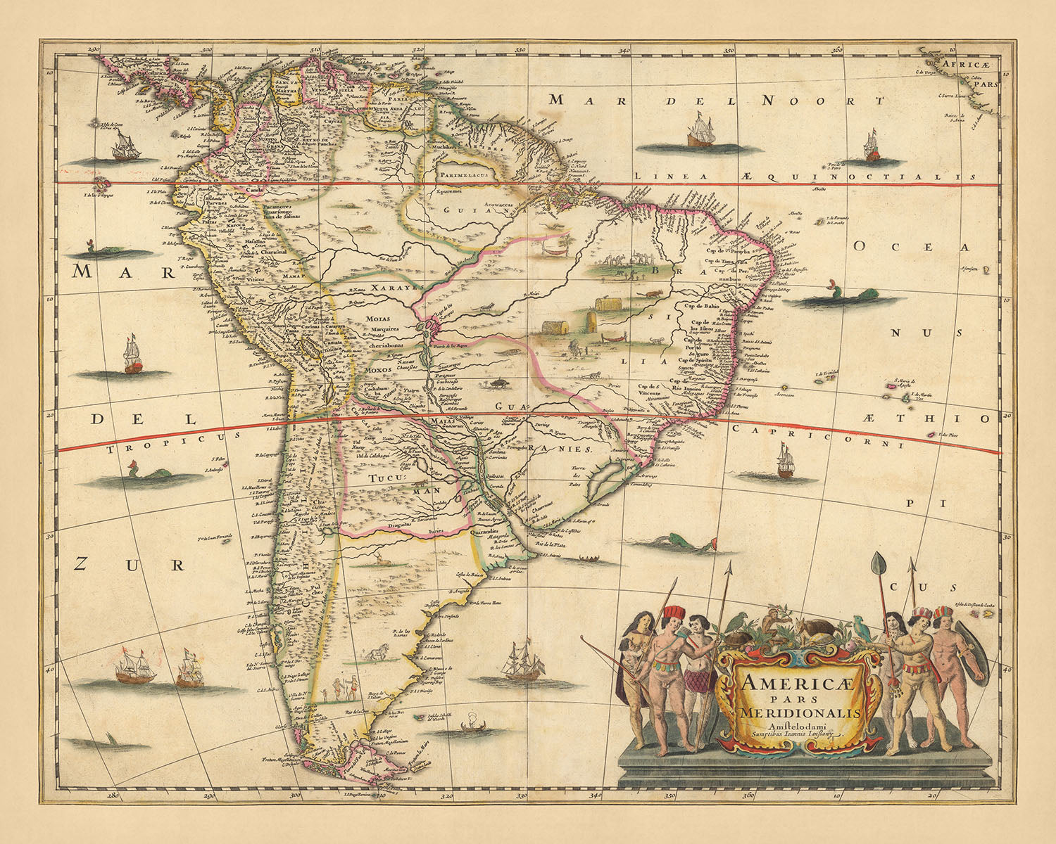 Auf der Karte sind prominente Städte wie Brasilia und Buenos Aires sowie bemerkenswerte Sehenswürdigkeiten wie die Falklandinseln und die Galapagosinseln abgebildet. Auch die riesige Fläche des Amazonas-Regenwaldes ist wunderschön dargestellt und bietet einen Einblick in die reiche Artenvielfalt, die diesen Teil der Welt auszeichnet. Jede Stadt, jedes Wahrzeichen und jede Region ist akribisch detailliert und spiegelt Visschers Engagement für Genauigkeit und sein außergewöhnliches künstlerisches Talent wider.