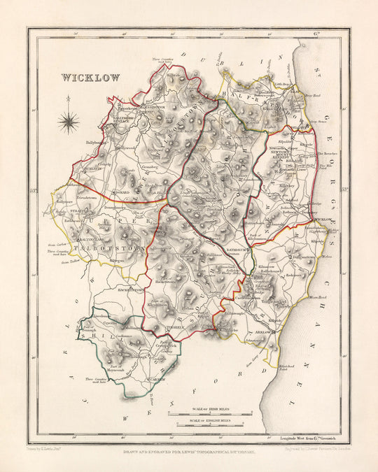 Die „Alte Karte von Wicklow von Samuel Lewis, 1844“ ist ein fesselndes Stück kartografischer Geschichte, das einen Einblick in die Vergangenheit bietet. Diese sorgfältig gestaltete Karte zeigt die Region County Wicklow in Irland in der Mitte des 19. Jahrhunderts. Es dient als Fenster in eine vergangene Zeit und ermöglicht es Ihnen, die historischen Grenzen, Städte und Wahrzeichen zu erkunden, die diese Region geprägt haben.