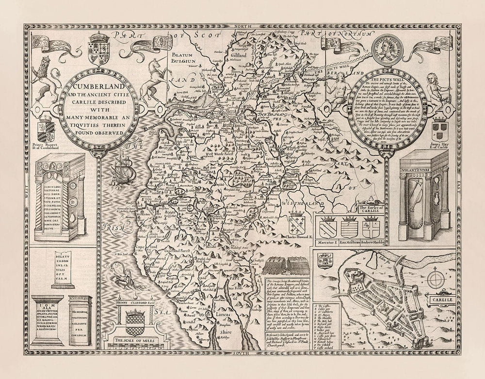 Alte Karte von Cumbria, 1611 von John Speed: Cumberland, Carlisle, Keswick, Lake District, Windermere, Pikten & Hadriansmauer