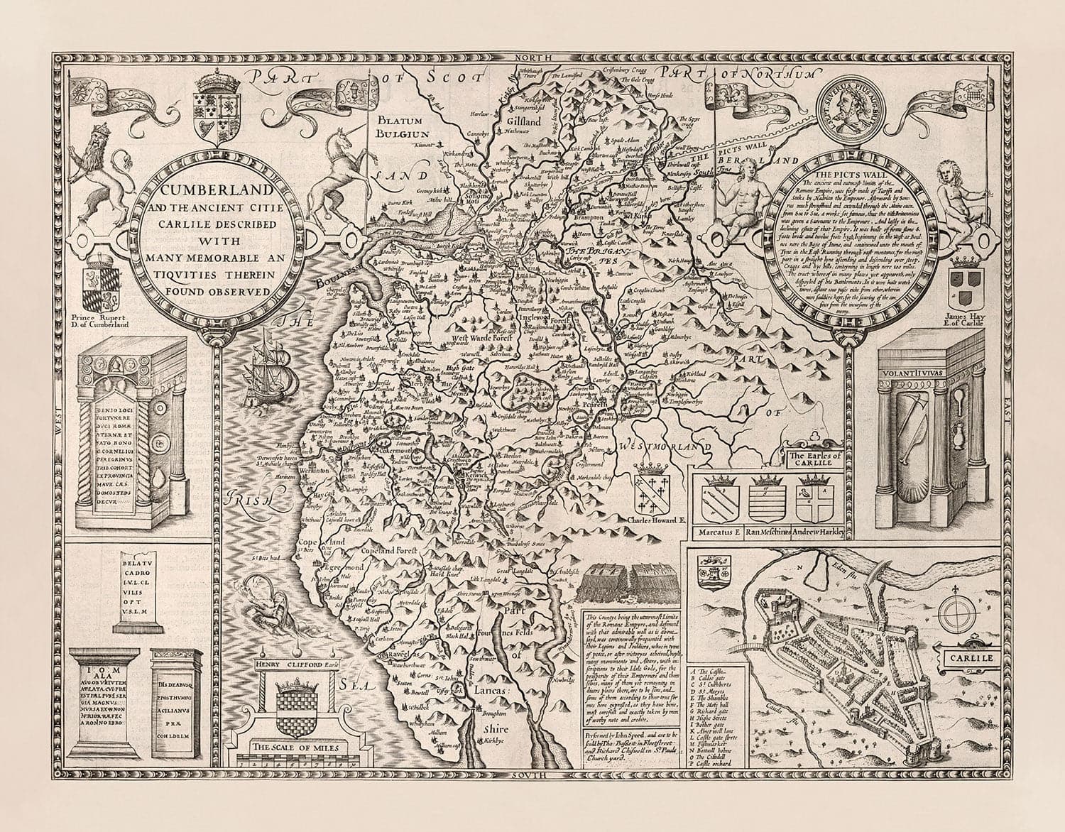 Eine detaillierte Gravur von Carlisle, der Grafschaftshauptstadt, befindet sich in der unteren rechten Ecke der Karte.