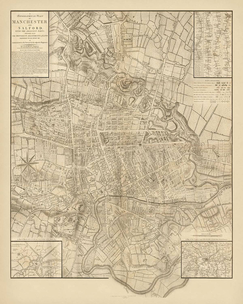 „A Topographical Plan of Manchester and Salford with the Adjacent Parts“ aus dem Jahr 1793 ist ein faszinierendes Stück kartografischer Geschichte und bietet einen seltenen Einblick in die aufstrebende Stadtlandschaft Manchesters im späten 18. Jahrhundert. Diese von Charles Laurent erstellte Karte ist nicht nur ein Beweis für die akribische Kunst früher Vermessungsarbeiten, sondern auch ein Spiegelbild der rasanten Entwicklung der Stadt. Laurent nutzte die Gelegenheit, vor dem berühmten William Greene zu veröffentlichen, und nutzte Greenes Vermessungsdaten gekonnt, um diese detaillierte Darstellung Manchesters zu erstellen, die die geplanten Entwicklungen zeigt, die die Zukunft der Stadt prägen würden.