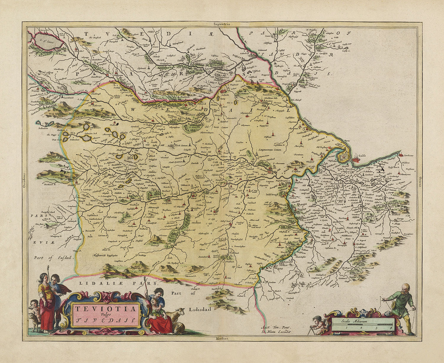 Diese äußerst seltene, alte farbige Karte des Landkreises Roxburgh in Schottland wurde von dem Meisterkartenmacher Joan Blaeu aus seiner Werkstatt in Amsterdam erstellt und ursprünglich 1665 als Teil seines Theatrum Orbis Terrarum Sive Atlas Novus veröffentlicht.