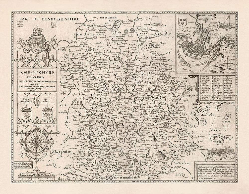 Alte Karte von Shropshire im Jahr 1611 von John Speed: Shrewsbury, Telford, Bridgnorth, Oswestry, Newport, Ludlow
