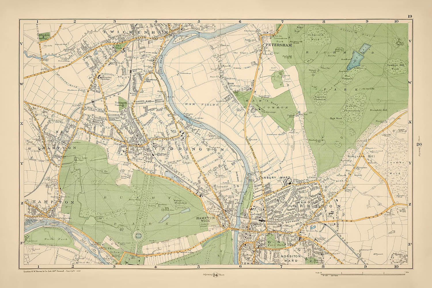 Die Stadtviertel Ham, Teddington und Twickenham sind prominent vertreten, jedes mit seinem eigenen einzigartigen Charme und historischer Bedeutung. Diese Gebiete, die entlang der Themse liegen, werden präzise dargestellt und zeigen das komplexe Netz von Straßen und Wegen, das sie definiert. Die Karte bietet einen faszinierenden Schnappschuss dieser Gemeinschaften, wie sie vor über einem Jahrhundert waren, und gibt Einblicke in ihre Entwicklung und anhaltende Anziehungskraft.
