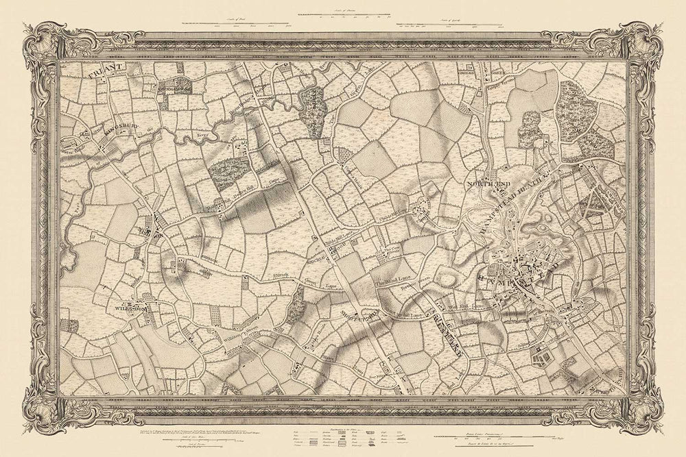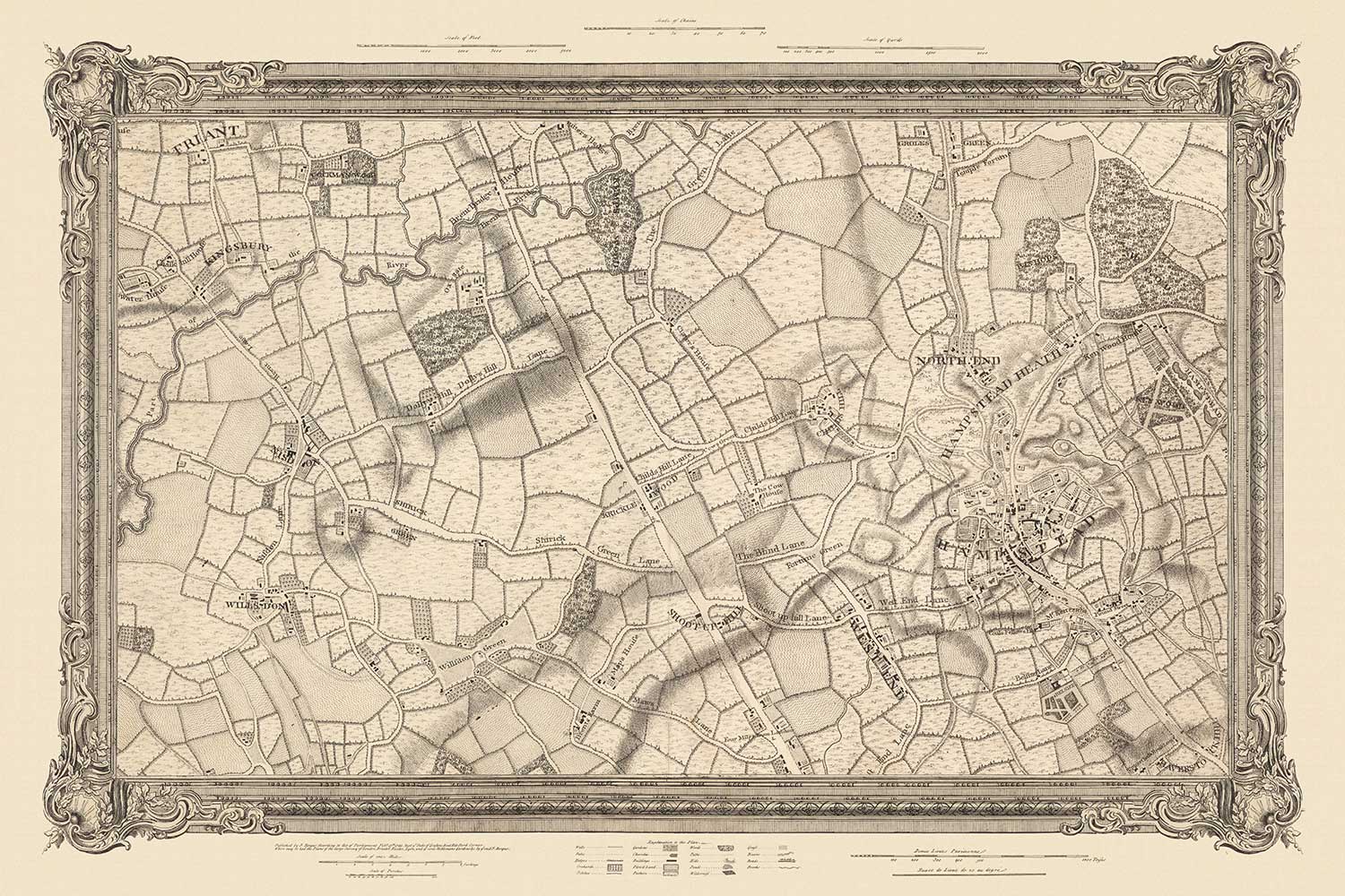 Vor fast 300 Jahren von dem Meisterkartenmacher John Rocque veröffentlicht, ist dies die erste detaillierte Karte von Nordwest-London und West-London. Sie wurde ursprünglich 1746 veröffentlicht, nach einer äußerst genauen Vermessung von London und seinen Vororten, die 1740 begann. Es ist eine schöne, hochdetaillierte und äußerst seltene alte Karte.