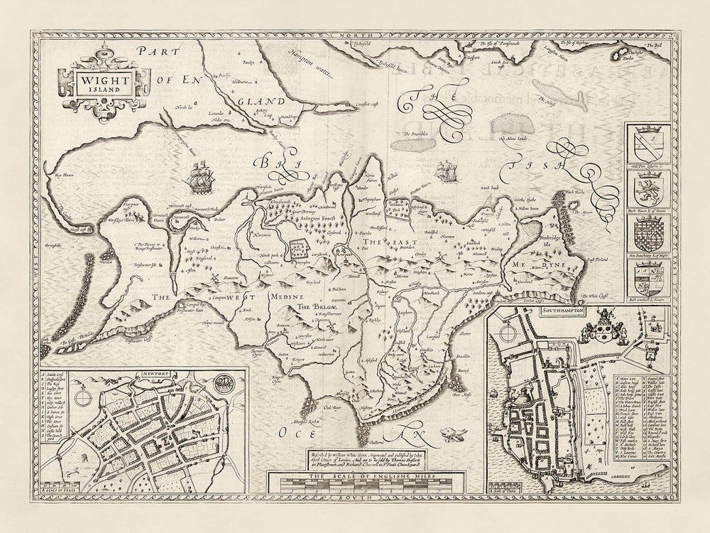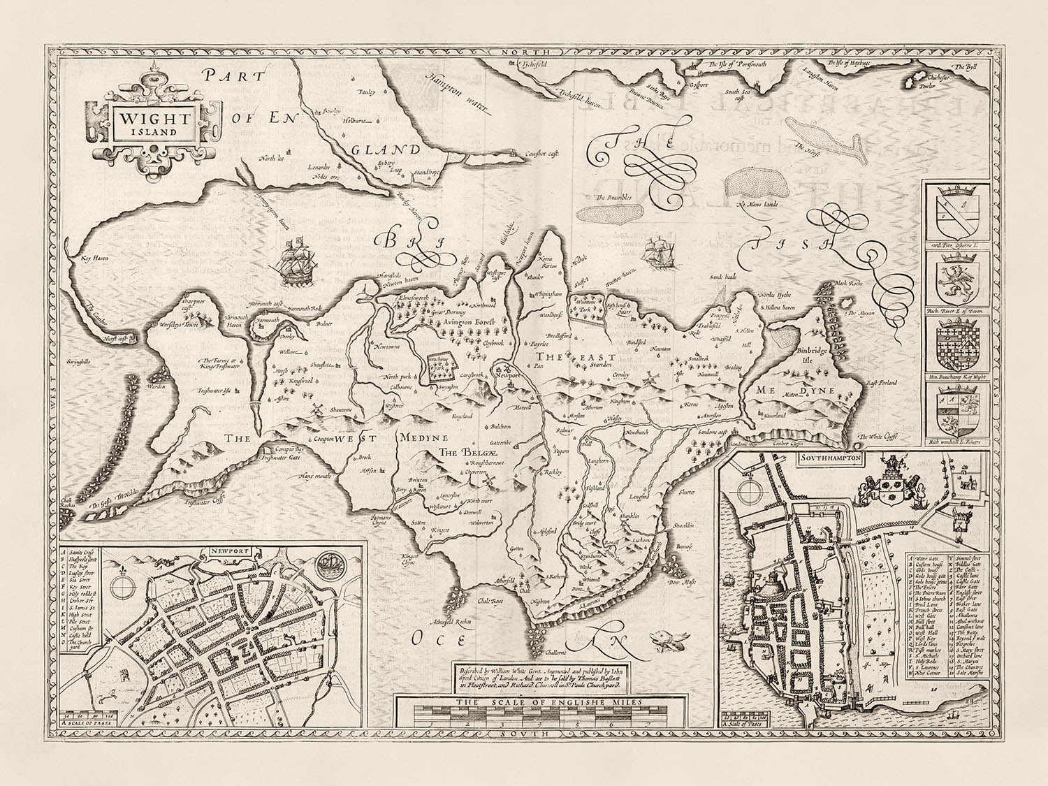 Alte monochrome Karte der Isle of Wight, 1611 von John Speed: Newport, Ride, Cowes, Sandown, Shanklin, Southampton
