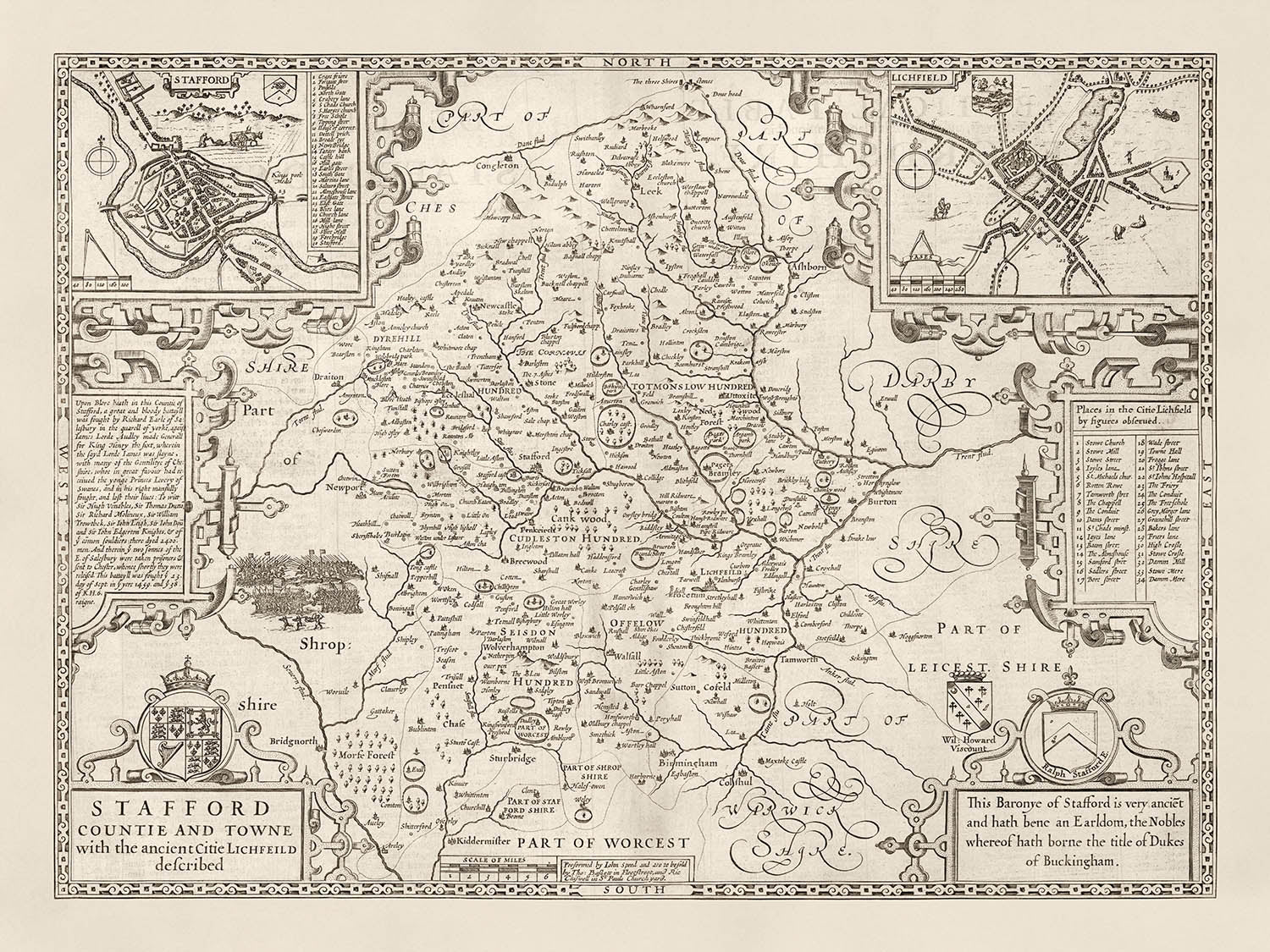 Viele der Städte, Dörfer und Gemeinden in Staffordshire sind bereits auf dieser Karte sichtbar. Im 17. Jahrhundert umfasste Staffordshire einen großen Teil dessen, was heute die West Midlands ist. Wolverhampton, Birmingham und Walsall sind alle auf dieser Karte.