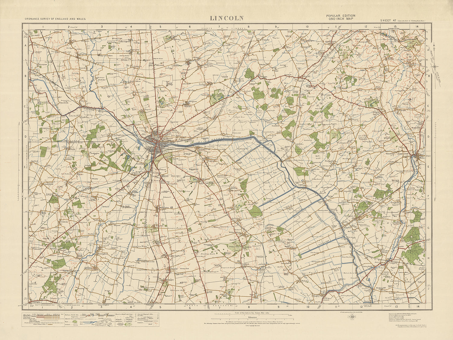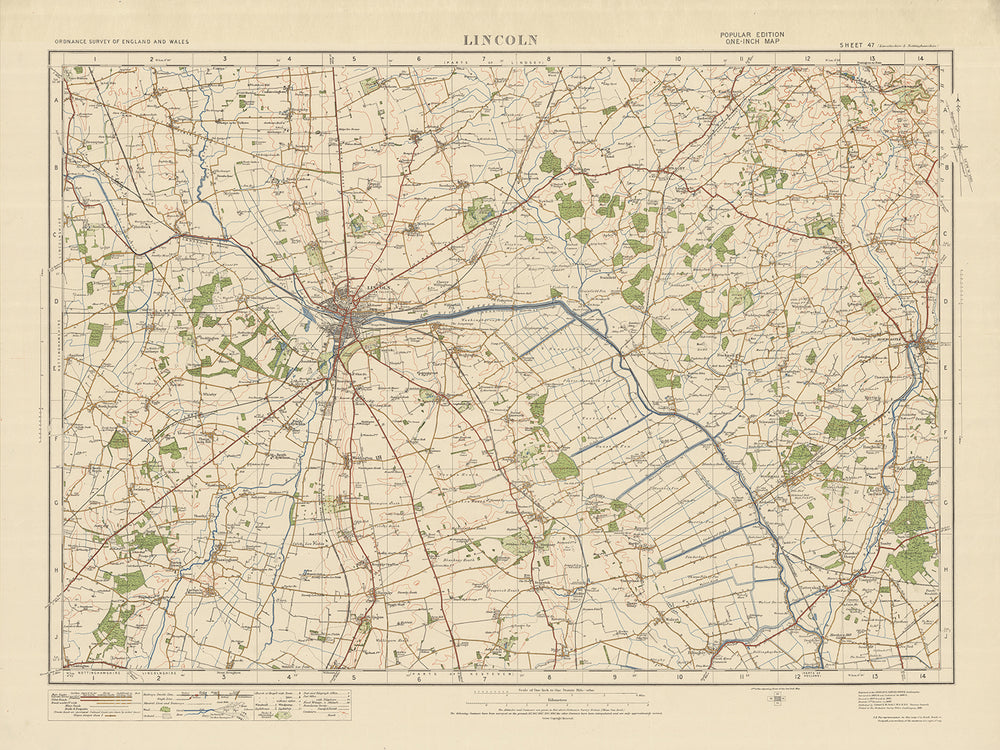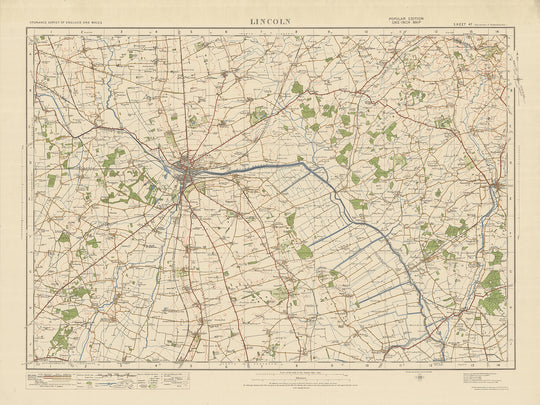 Die Karte „Blatt 47 – Lincoln“ aus der One-Zoll-Ausgabe „Popular“ von Ordnance Survey, England und Wales, veröffentlicht 1925, ist ein außergewöhnliches Stück kartografischer Geschichte. Diese akribisch detaillierte Karte zeigt die Stadt Lincoln und ihre Umgebung und bietet einen faszinierenden Einblick in die Vergangenheit. Neben Lincoln zeigt diese Karte mehrere bemerkenswerte Städte und Orte, darunter Horncastle, Woodhall Spa, Wragby, North Hykeham und Metheringham.