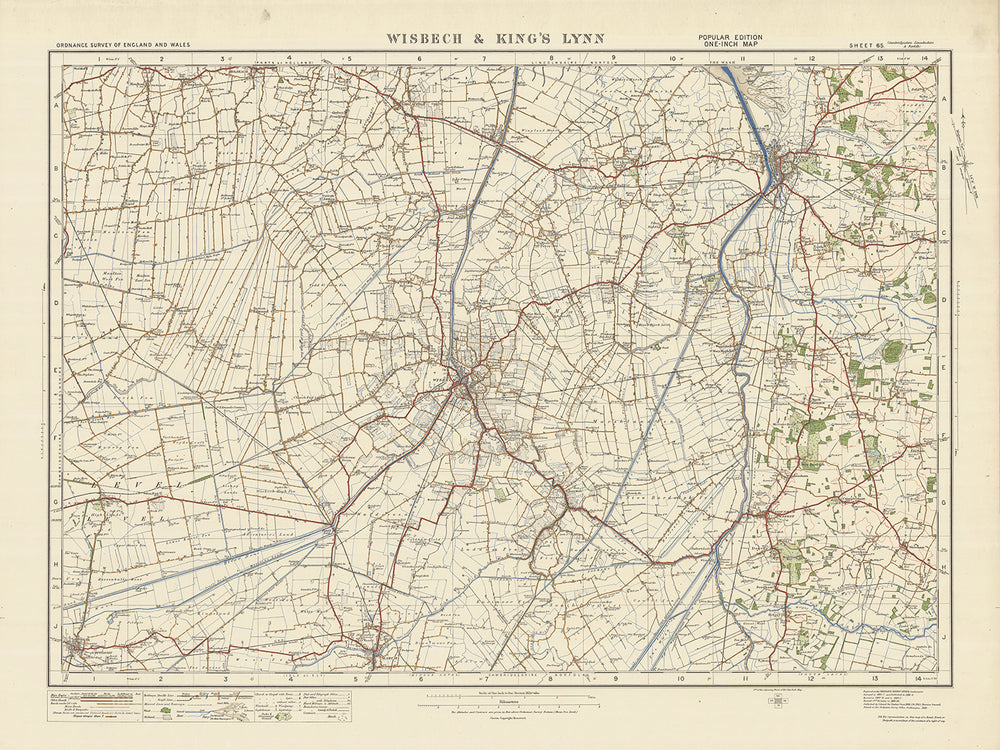 Diese alte Ordnance Survey-Karte, Blatt 65 – Wisbech & Kings Lynn, ist ein faszinierendes Stück kartografischer Geschichte aus der 1925 veröffentlichten One-Zoll-„Popular“-Ausgabe von England und Wales. Die Karte zeigt die Städte Wisbech & Kings Lynn, zusammen mit mehreren anderen bemerkenswerten Siedlungen und Merkmalen in der Umgebung.