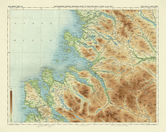 Bartholomews Karte bietet eine lebendige Darstellung der schottischen Highlands, insbesondere der Regionen Gair Loch und Loch Inver. Das Design der Karte verwendet eine subtile Farbmischung, um verschiedene Höhenlagen hervorzuheben und das zerklüftete Gelände der Highlands mit bemerkenswerter Klarheit zu zeigen. Berge wie Beinn Dearg, An Teallach und Suilven ragen markant in die Höhe, während die ruhigen Gewässer von Loch Maree, Loch Broom und Loch Assynt einen ruhigen Kontrast bilden. Dieses harmonische Gleichgewicht von Land und Wasser wird mit einer Eleganz eingefangen, die nur Bartholomew erreichen konnte.