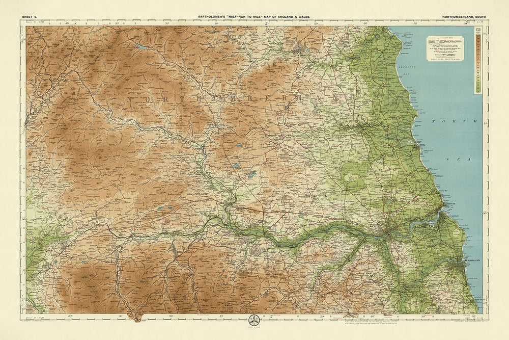 Bartholomews Expertise strahlt in dieser Karte hervor, die auf einer reduzierten Ordnance Survey-Karte aus derselben Zeit basiert. Seine akribische Aufmerksamkeit für Details zeigt sich in der klaren Abgrenzung politischer Grenzen und der komplexen Darstellung physischer Merkmale. Die Karte deckt eine Landschaft ab, die sich 36 Meilen von Norden nach Süden und 52 Meilen von Westen nach Osten erstreckt und eine vielfältige Palette von Terrains und Wahrzeichen umfasst. Von den sanften Cheviot Hills bis zur ruhigen Küste der Nordsee erzählt jeder Zoll dieser Karte eine Geschichte des reichen Erbes und der natürlichen Pracht des Landes.