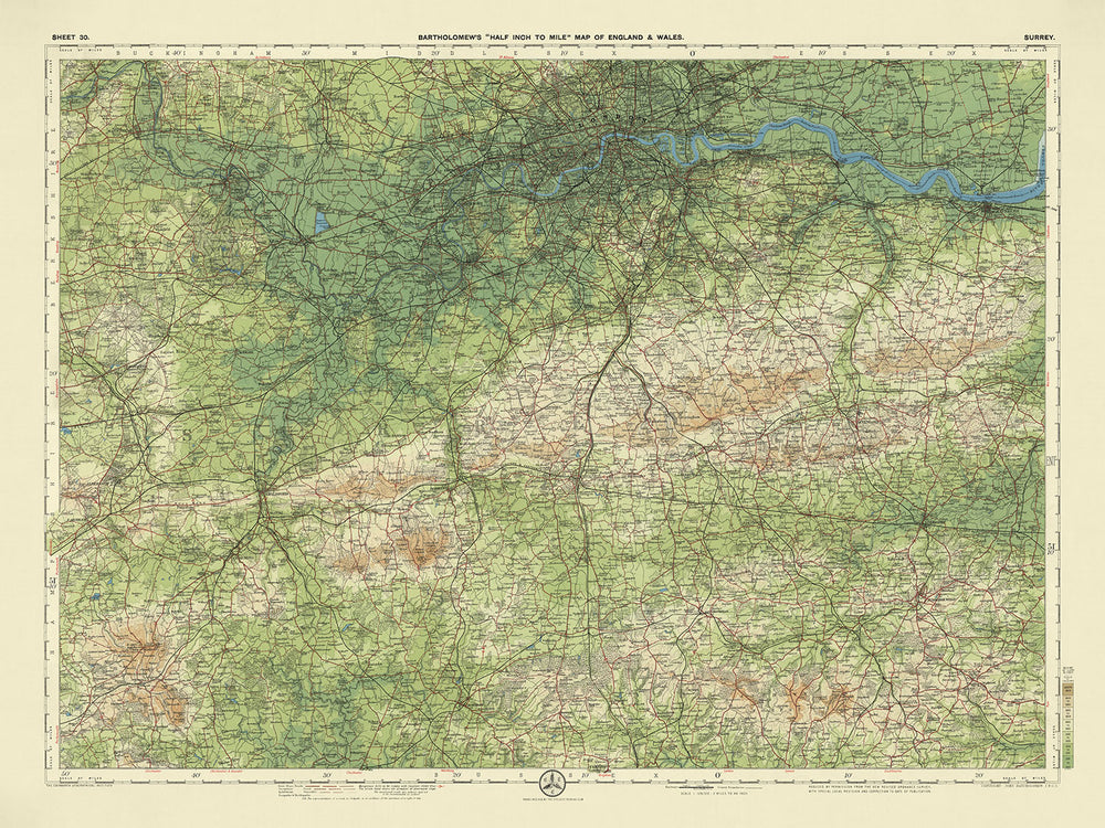 Schritt in die Vergangenheit mit dem exquisiten "Sheet 30 - Surrey," einem Meisterwerk, das von dem renommierten Kartografen JG Bartholomew im Jahr 1901 geschaffen wurde. Diese Karte, Teil von Bartholomews gefeierter Serie "Half-Inch to the Mile," ist ein Zeugnis für die Kunstfertigkeit und Präzision der Kartografie des frühen 20. Jahrhunderts. Bartholomew, ein Lichtblick auf diesem Gebiet, war bekannt für seine innovativen Techniken und seine akribische Liebe zum Detail. Seine Karten waren nicht nur Navigationshilfen, sondern Kunstwerke, die die Fantasie von Radfahrern, Touristen und Geografie-Enthusiasten beflügelten.