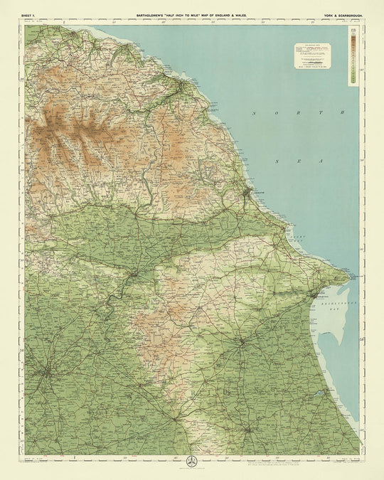 Blatt 7 - York & Scarborough, erstellt von dem angesehenen Kartografen J.G. Bartholomew im Jahr 1901, ist eine meisterhafte Darstellung der kartografischen Kunst des frühen 20. Jahrhunderts. Diese Karte, Teil von Bartholomews Flaggschiff-Halb-Zoll-Serie, wurde mit Blick auf Radfahrer und Touristen entworfen und bietet eine detaillierte und farbenfrohe Darstellung der Region Yorkshire. Die innovative Verwendung von Farbverläufen zur Darstellung des Landschaftsreliefs zeigt Bartholomews bahnbrechende Techniken und macht sie nicht nur zu einem funktionalen Werkzeug für die Navigation, sondern auch zu einem visuell beeindruckenden Kunstwerk.