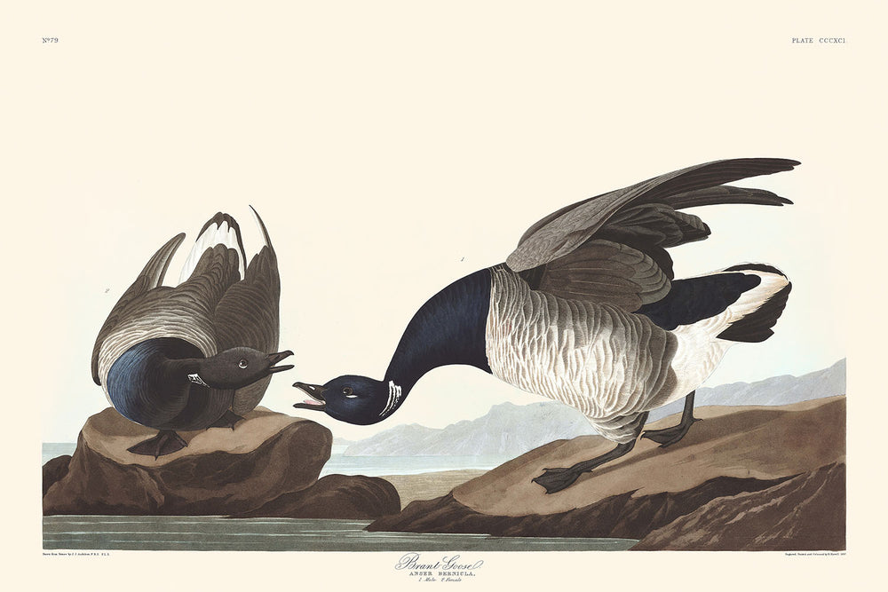 Audubons Brandgans ist besonders bemerkenswert für ihre lebensechten Details und die reiche Beschreibung der Gewohnheiten und Lebensräume der Art. Die Illustration erweckt die subtilen Farbtöne und Federungsvariationen der Gans zum Leben, die Audubon durch genaue Beobachtung sorgfältig wiedergegeben hat. Der begleitende Text bietet faszinierende Einblicke in die Wanderungsmuster und Verhaltensweisen der Brandgans, wodurch dieser Druck nicht nur ein Kunstwerk, sondern auch ein wertvolles Bildungsinstrument ist.