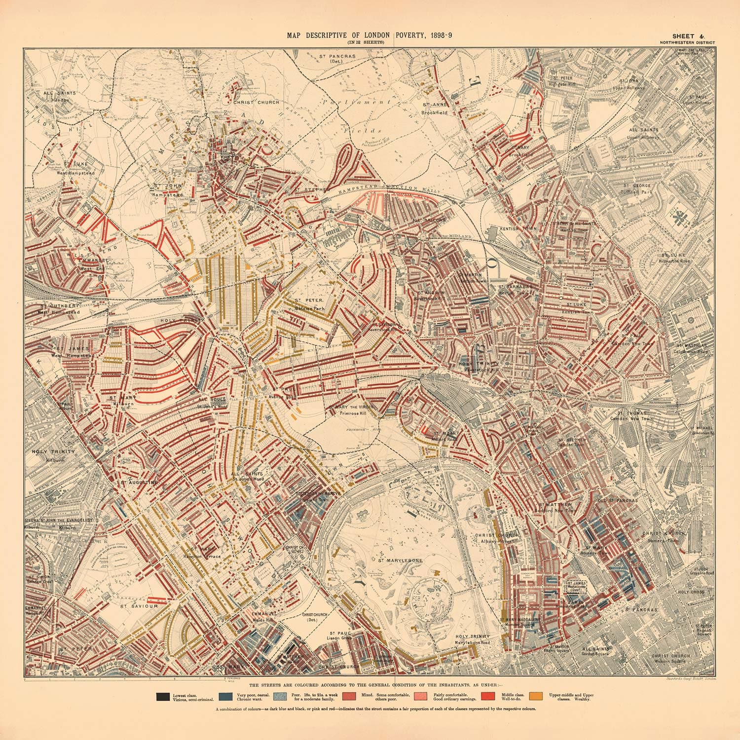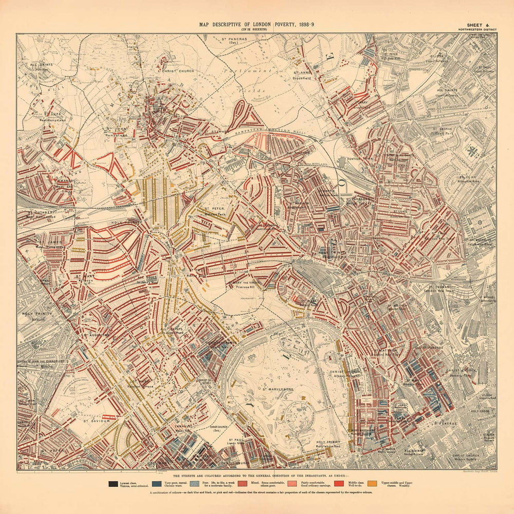 Der Detailgrad in diesen Karten ist atemberaubend, mit einzelnen Häusern, die farblich markiert sind, um zu zeigen, ob sie "bösartige Halbkriminelle" (schwarz); "sehr arm" (dunkelblau); "arm" (hellblau); "gemischt" (rot); "ziemlich komfortabel" (hellrot); "mittlere Klasse" (leuchtend rot); "obere Mittel- und Oberschicht" (gelb) sind.