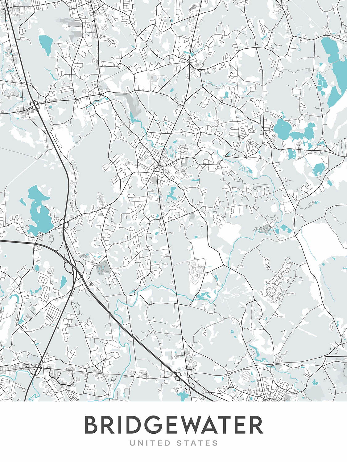 Diese Bridgewater-Karte ist eine Hommage an moderne Kartografie und Design. Mit ihren klaren Linien und gedämpften Farben verleiht diese Karte jedem Zuhause oder Büro einen Hauch von Eleganz. Die Karte konzentriert sich auf die Stadt Bridgewater in Massachusetts und erstreckt sich etwa 9 Meilen nördlich des Stadtzentrums, 9 Meilen südlich, 7,5 Meilen östlich und 7,5 Meilen westlich. Dies umfasst die gesamte Stadt Bridgewater sowie Teile der Nachbarstädte Raynham, Easton, Whitman, Brockton und Halifax.