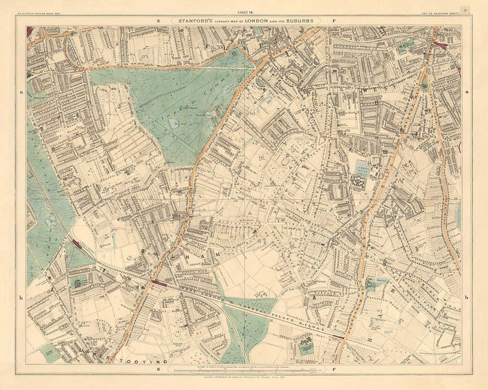 Die Karte wurde ursprünglich in 24 Blättern veröffentlicht. Insgesamt hätte die Karte etwa 2 Meter breit (78 Zoll) gemessen. Dies hier ist Blatt 18, das sich auf Clapham, Clapham Common und Balham in den Londoner Stadtteilen Lambeth und Wandsworth konzentriert.