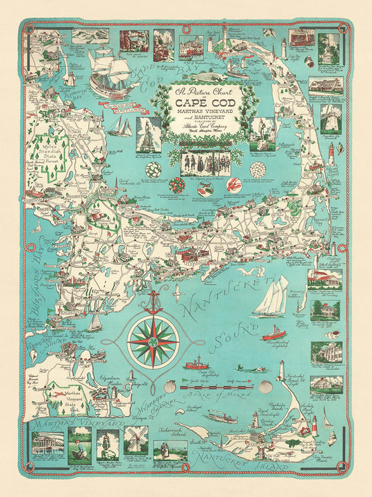 Das Hauptthema dieser Karte sind Cape Cod, Martha's Vineyard und Nantucket. Es handelt sich um eine bildliche Karte, die verschiedene Wahrzeichen, Attraktionen und Aktivitäten in diesen Gebieten darstellt.