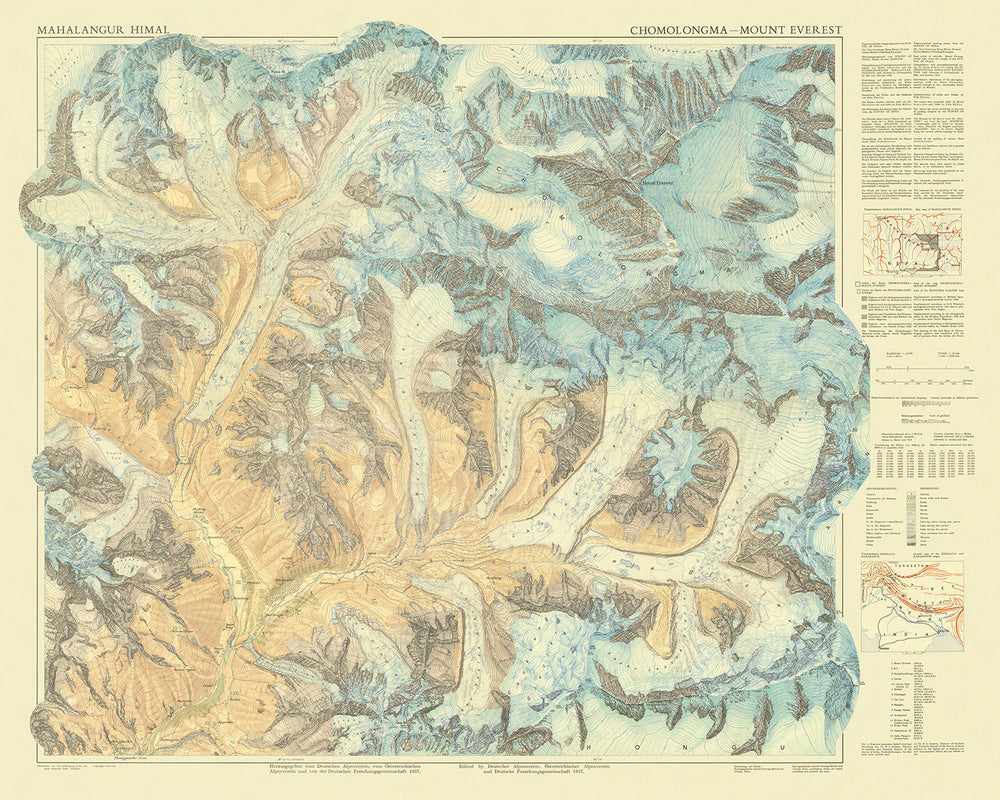 Wir präsentieren die Karte Mahalangur Himal: Chomolongma – Mount Everest, ein Meisterwerk kartografischer Geschichte, die 1957 von Erwin Hermann Manfred Schneider erstellt wurde. Diese Karte ist die erste, die die gesamte Mount Everest-Khumbu-Region in einem beispiellosen Maßstab von 1:25.000 darstellt. Die Karte entstand aus dem intensiven Interesse, das durch die erste erfolgreiche Besteigung des Mount Everest durch Sir Edmund Hillary und Tenzing Norgay im Jahr 1953 geweckt wurde. Schneiders sorgfältige Feldarbeit während der Internationalen Himalaya-Expedition 1955, gepaart mit der künstlerischen Finesse von Fritz Ebster, führte zu einer Karte, die sowohl ein wissenschaftlicher Triumph als auch ein Kunstwerk ist.