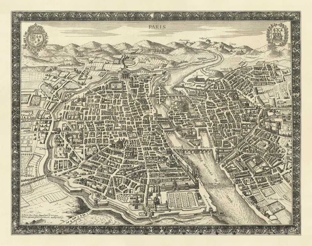 Eine schmerzlich schöne Vogelperspektivenkarte von Paris, veröffentlicht von Jean Sauve im Jahr 1670. Damals waren die ältesten Teile der Stadt bereits weitgehend bebaut, aber viele der Wahrzeichen, die Paris heute berühmt machen, waren noch nicht gebaut.