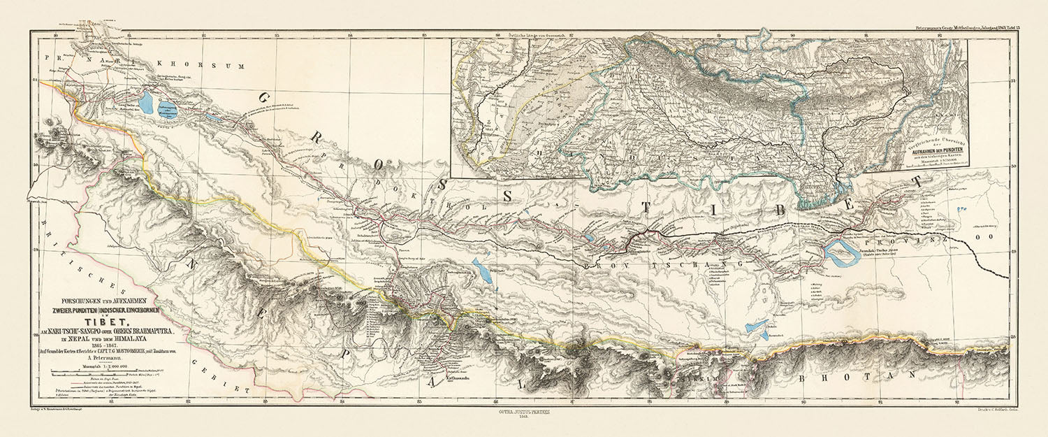 Schreiten Sie in das reiche Gewebe der Geschichte mit dieser exquisiten Karte, "Forschungen und Aufnahmen Zweier Punditen (Indischer Eincebornen) In Tibet, Am Nari-Tschu-Sangpo Oder Obern Brahmaputra, In Nepal Und Dem Himalaya 1865-1867," die vom renommierten Kartografen Augustus Herman Petermann im Jahr 1868 erstellt wurde. Diese handkolorierte lithografische Karte bietet einen detaillierten Einblick in das Dach der Welt, einschließlich der Sikkim-Bhutan-Tibet Dreiländerregion. Sie wurde nur drei Jahre nachdem der Mount Everest von der British Royal Geographical Society benannt wurde, erstellt und ist ein Zeugnis für die akribischen Vermessungsarbeiten des 19. Jahrhunderts, die das Wesen einer Region einfangen, die seit langem Entdecker und Wissenschaftler fasziniert.