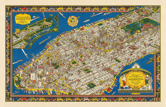 Die meisten modernen Merkmale von Manhattan sind bereits in dieser antiken Karte vorhanden. Werfen Sie einen Blick auf die Innenstadt, dominiert vom New Yorker Telefongebäude, der Sängerauflage und des Woolworth-Gebäudes.
