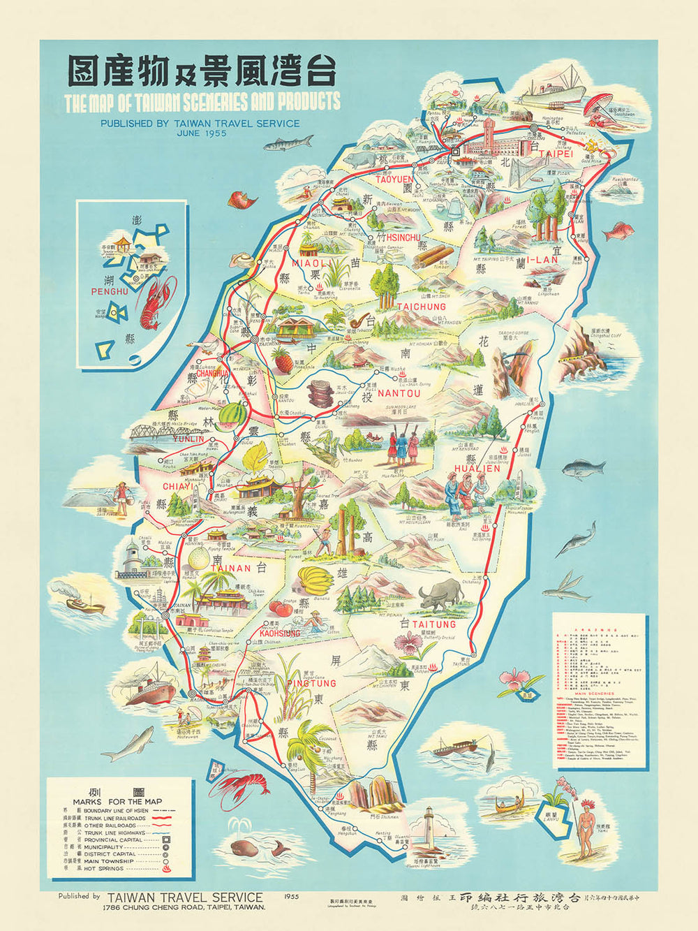Alter bildlicher Stadtplan von Taiwan, 1955: Taipeh, Sonnen-Mond-See, Taroko-Schlucht, Chih Kan Turm, Konfuzius-Tempel