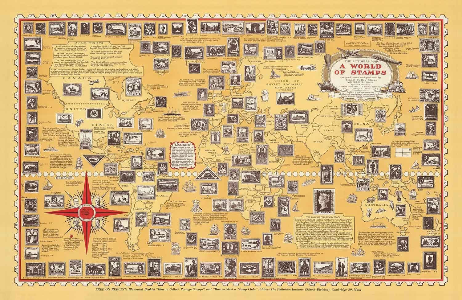 Diese eher einzigartige Weltkarte, ursprünglich 1947 von Ernest Dudley Chase veröffentlicht, zeigt Dutzende von hochdetaillierten Illustrationen von Briefmarken. Die Briefmarken sind überwiegend berühmte, seltene oder bedeutende Karten aus den frühen 1900er Jahren.