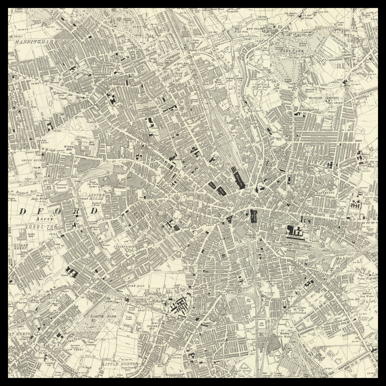 Ihre Karte wird die Bereiche aufdecken, die heute die Bradford Cathedral oder die historische St. George's Hall umfassen, und einen Einblick in die Vergangenheit bieten, bevor diese modernen Wahrzeichen errichtet wurden. Stellen Sie sich die belebten Straßen rund um das, was heute das Alhambra Theatre ist, oder die ruhigen Umgebungen vor, die Lister Park und Cartwright Hall vorausgingen. Diese Karten sind ein Portal zur Vergangenheit und zeigen die Landschaft von Bradford vor dem Aufkommen zeitgenössischer Entwicklungen.