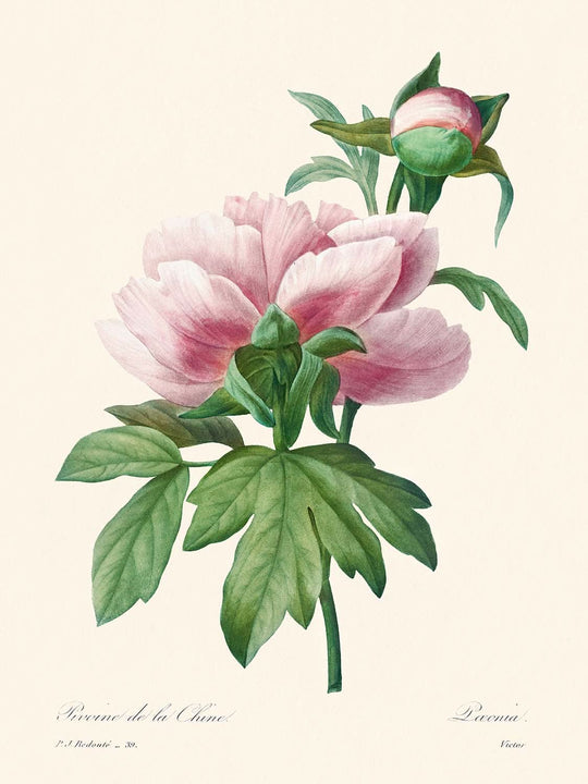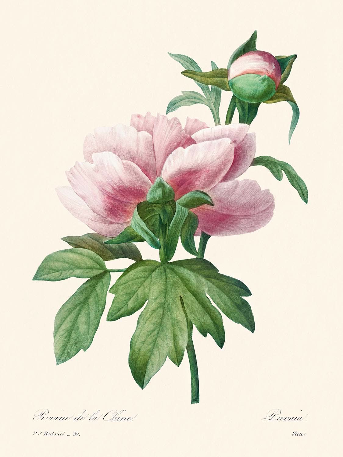 Redouté hatte schon früh Erfolg damit, Marie Antoinette das Malen beizubringen, bevor er seine einflussreiche Karriere als botanischer Illustrator begann. Seine akribische Liebe zum Detail und seine Liebe zum Pflanzenreich ermöglichten es ihm, innerhalb weniger Jahrzehnte über 2.100 botanische Gemälde zu veröffentlichen, in denen er über 1.800 verschiedene Arten dokumentierte. Das Bild „Pink Peony“ ist ein Beispiel für seine Hingabe und sein Können und zeigt die zarte Schönheit und Eleganz der Paeonia-Arten, die gemeinhin als Pfingstrose bekannt sind.