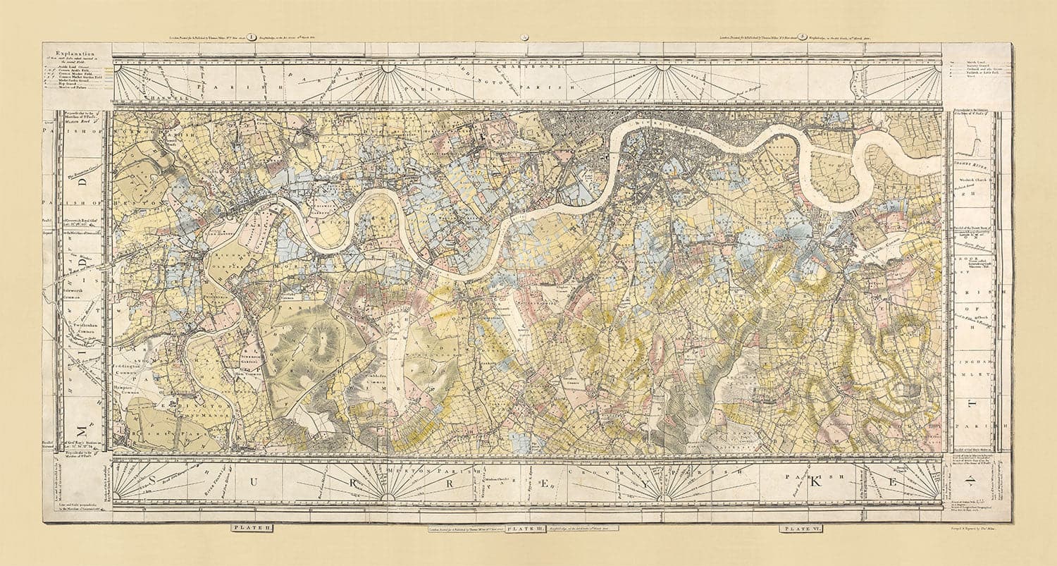 Dies ist eine sehr dekorative und äußerst seltene alte Karte von London von 1799 von Thomas Milne. Es wird hier in der ursprünglichen handfarbenen Form präsentiert. Diese Karte wurde von der einzigartigen Maps Co. in seiner Werkstatt in London liebevoll restauriert, aber es sieht immer noch schön alt und charaktervoll aus.
