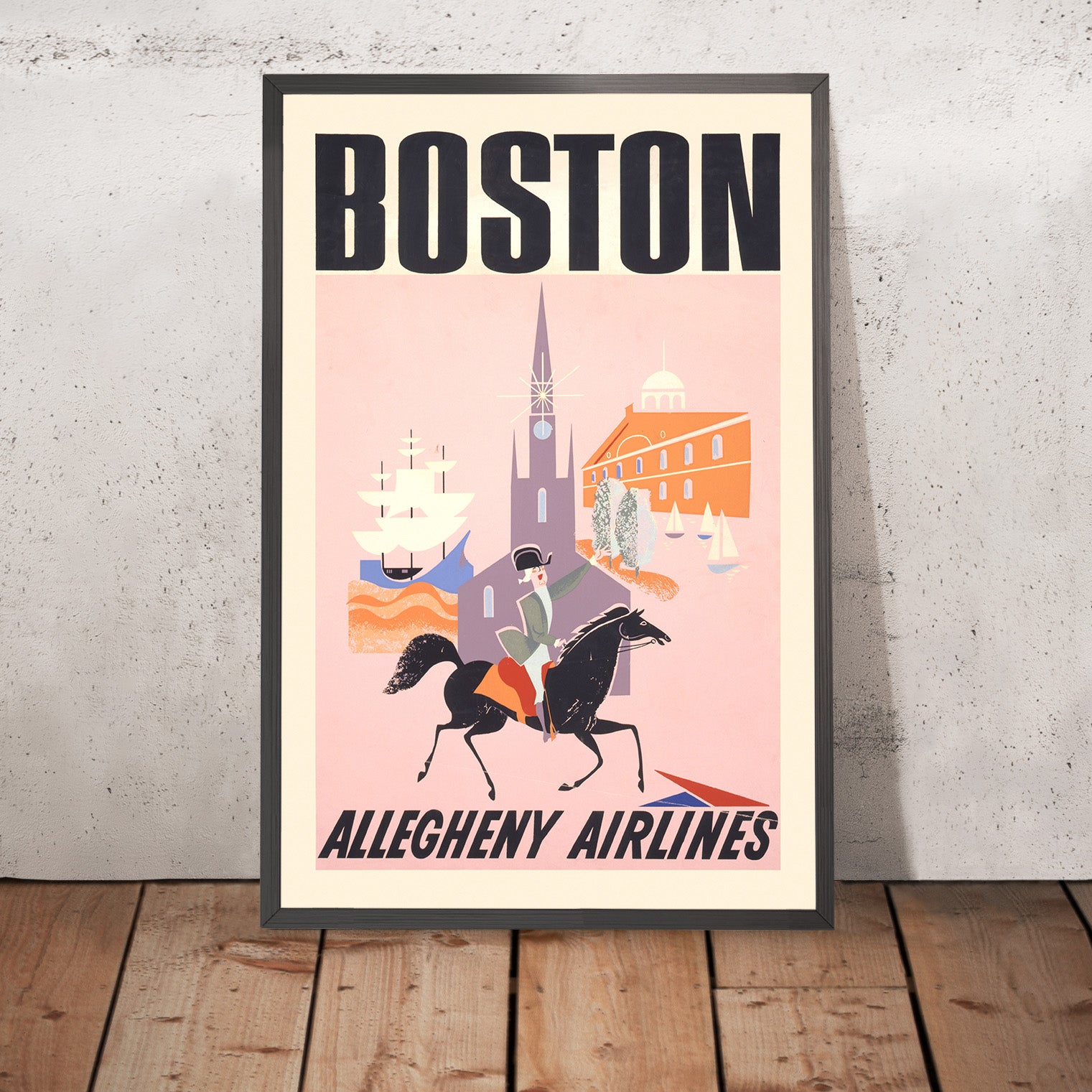 Boston – Allegheny Airlines is a charming mid‑century travel poster created in 1950 by an anonymous studio artist working for the airline’s advertising department. Designed to entice post‑war travelers to the New England hub, it distills Boston’s heritage into a lively vignette: a colonial rider in tricorne hat urges his horse across a rose‑pink ground while a steepled church sparkles with a starburst and a brick civic hall and white‑sailed boats anchor the harbor scene. The bold “BOSTON” masthead in deep black and the tri‑color Allegheny Airlines emblem complete the invitation.