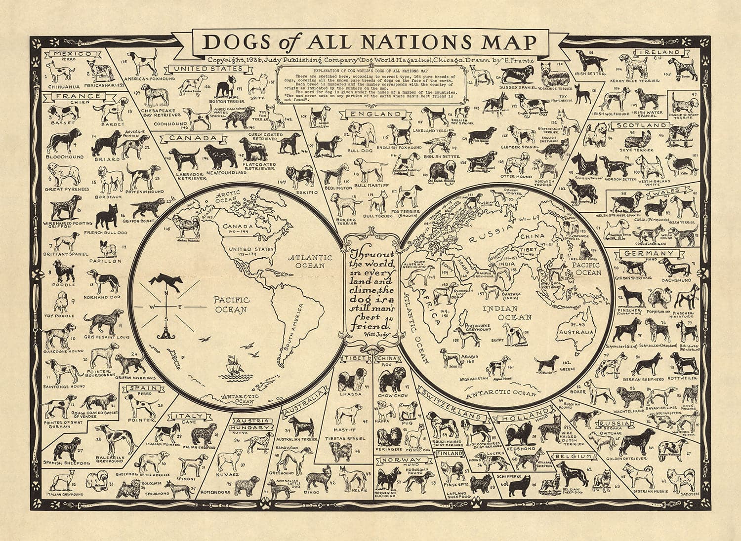Die Karte zeigt, wo jede der 164 Hunderassen ihren Ursprung hat - und wie nicht anders zu erwarten, sind England, Frankreich und Deutschland die Ursprungsländer der meisten von ihnen! Es werden Hunderassen aus folgenden Ländern gezeigt: Mexiko, Frankreich, Spanien, Italien, Österreich/Ungarn, Australien, Tibet, China, Norwegen, Schweiz, Finnland, Holland, Belgien, Russland, Deutschland, Wales, Schottland, Irland, England, Kanada und die Vereinigten Staaten.
