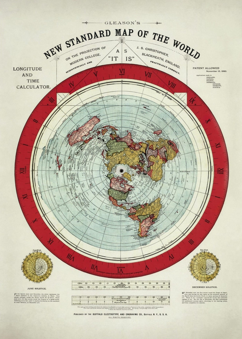 Veröffentlicht im Jahr 1892, glaubte der Ersteller dieser Karte, Alexander Gleason, ebenfalls, dass die Welt flach sei. Obwohl es dafür keine Beweise gab, schrieb er sogar 'WISSENSCHAFTLICH UND PRAKTISCH KORREKT' oben auf die Karte. Dies ist eine ziemlich clevere Karte - die Zahlen um den Rand der zentralen Scheibe zeigen, dass Längengrad und Zeitzonen ganz einfach berechnet werden können, indem man den Globus abflacht.