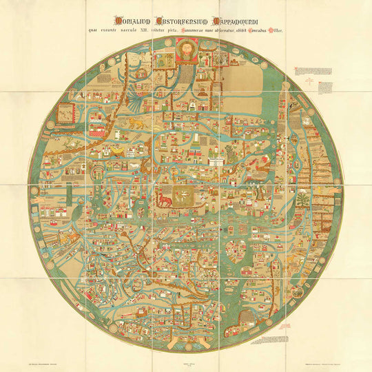 Tauchen Sie mit dieser sorgfältig gestalteten Karte in die komplizierten Details der Welt des 13. Jahrhunderts ein und konzentrieren Sie sich dabei auf den Mittelmeerraum und darüber hinaus. Diese Reproduktion der Ebstorfer Mappa Mundi bietet einen einzigartigen Einblick in die Wahrnehmungen und geografischen Kenntnisse des Mittelalters, erweckt von einem anonymen Kartographen zum Leben erweckt. Die ursprünglich im 13. Jahrhundert veröffentlichte Karte ist ein Beweis für die Kunstfertigkeit und den Ehrgeiz mittelalterlicher Kartographen und bietet ein fesselndes und lehrreiches Werk für jeden Geschichts- und Kartenliebhaber.