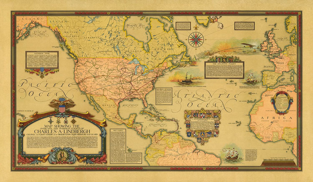 Geografisch erstreckt sich die Karte über Kontinente und zeigt Nordamerika, Europa und Afrika sowie wichtige Länder wie die Vereinigten Staaten, Frankreich und Marokko. Gewässer, darunter der Pazifik und der Atlantik, sind elegant beschriftet und bieten einen Kontext zu Lindberghs waghalsigen Reisen. Überall auf der Karte verteilte Anmerkungen und historische Notizen bieten Einblicke in bedeutende Orte und Ereignisse und machen sie zu einer Fundgrube an Informationen für Geschichtsliebhaber.