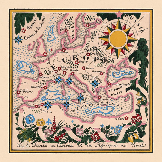 Alte Karte von Europa und Nordafrika von Mazuyer, 1931: Bildstil, Blumengrenze, Kompassrose