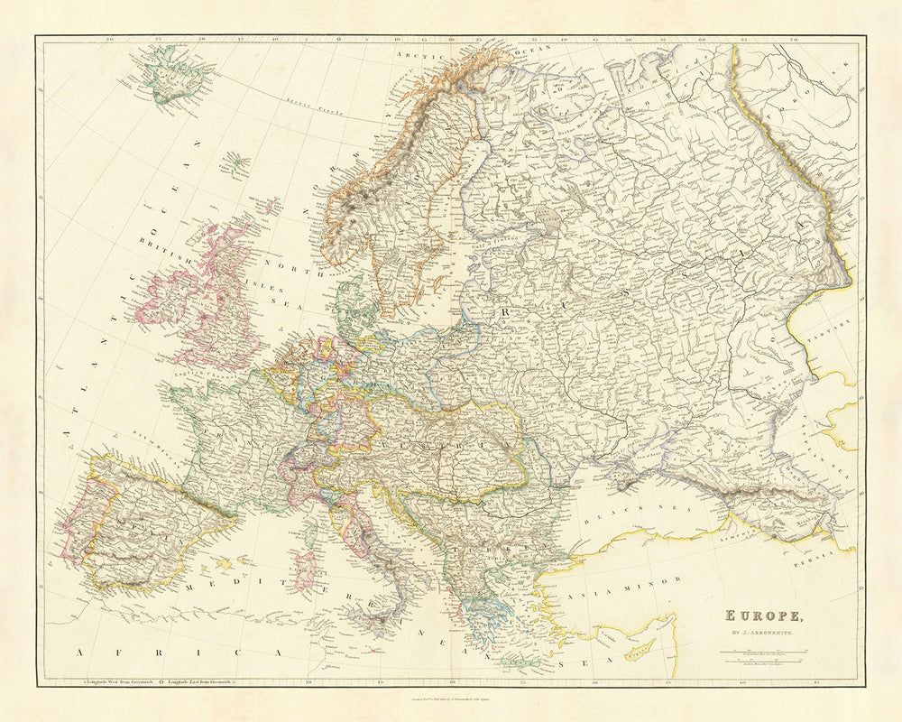 Arrowsmiths akribische Aufmerksamkeit für Details und seine Fähigkeit, Ästhetik mit Genauigkeit zu kombinieren, sind in dieser Karte deutlich erkennbar. Der Stil ist eine detaillierte politische und physische Karte, in der jedes Land umreißt und abgegrenzt ist, was die politischen Teilungen der damaligen Zeit widerspiegelt. Die physischen Merkmale des Kontinents, einschließlich seiner Gebirgszüge, Flüsse und Küstenlinien, sind ebenfalls kunstvoll dargestellt und bieten einen umfassenden Blick auf das vielfältige Terrain Europas. Diese Kombination aus politischen und physischen Details macht die Karte zu einem faszinierenden Studienobjekt für Historiker, Geografen und Kartografie-Enthusiasten gleichermaßen.